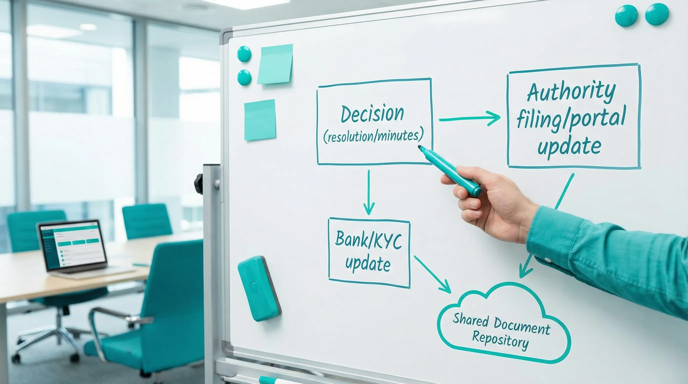 | Resolutions and minutes | Drafting, signature coordination, storage | Bank account, share transfer, manager change, major decisions | Decisions are valid, enforceable, and auditable |