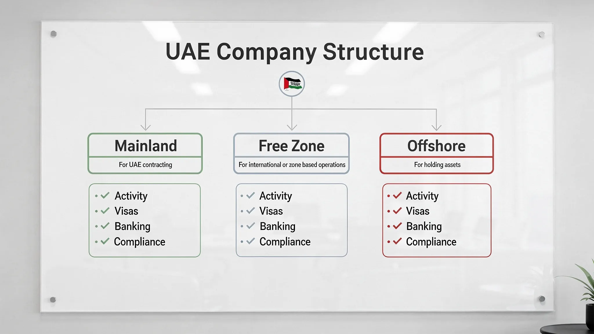 In many countries, “company structure” mostly means legal form (LLC, corporation, partnership). In the UAE, it typically includes three layers:
