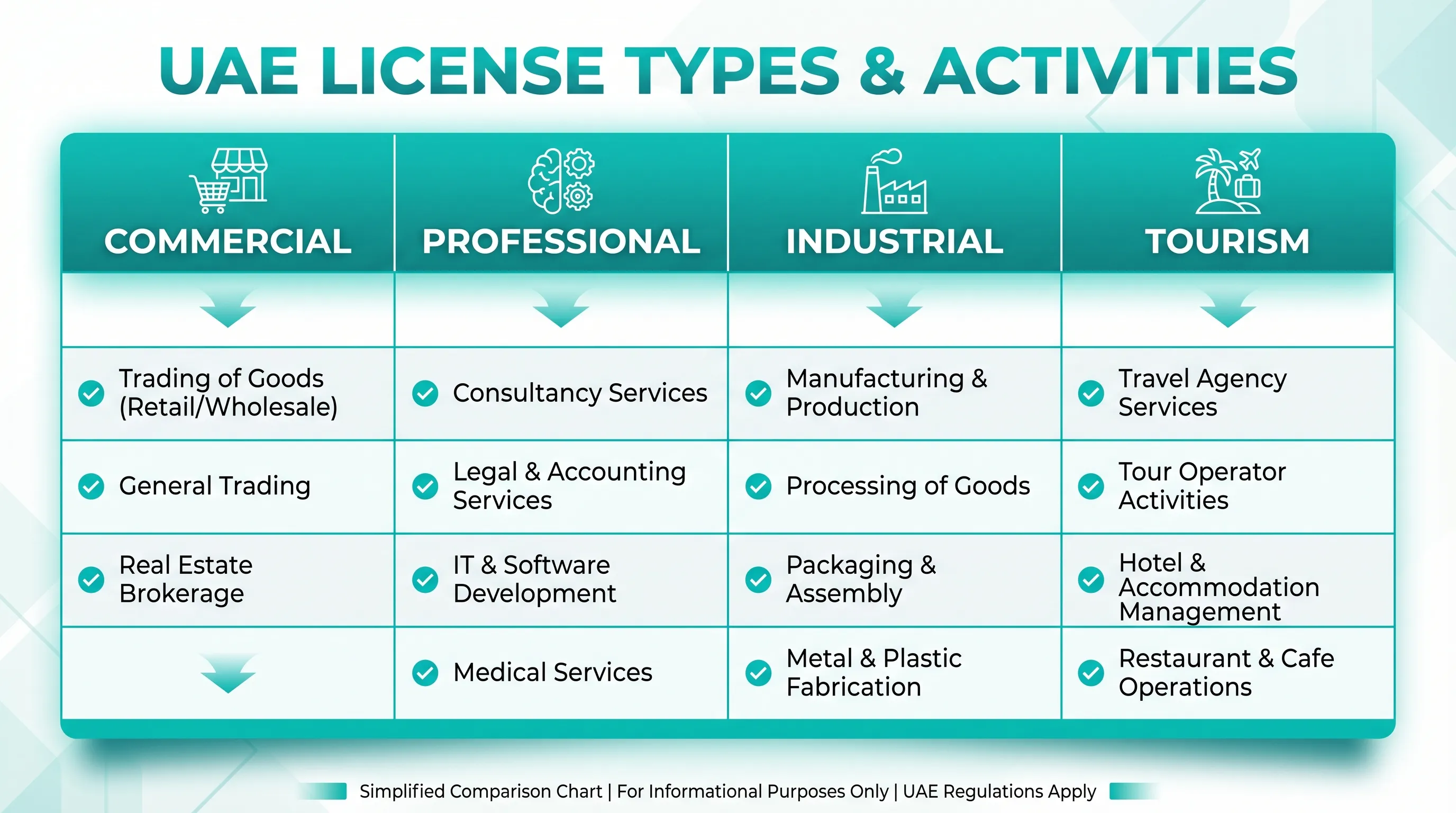 While naming conventions can vary by emirate and jurisdiction, most UAE setups fall under a few common license categories.