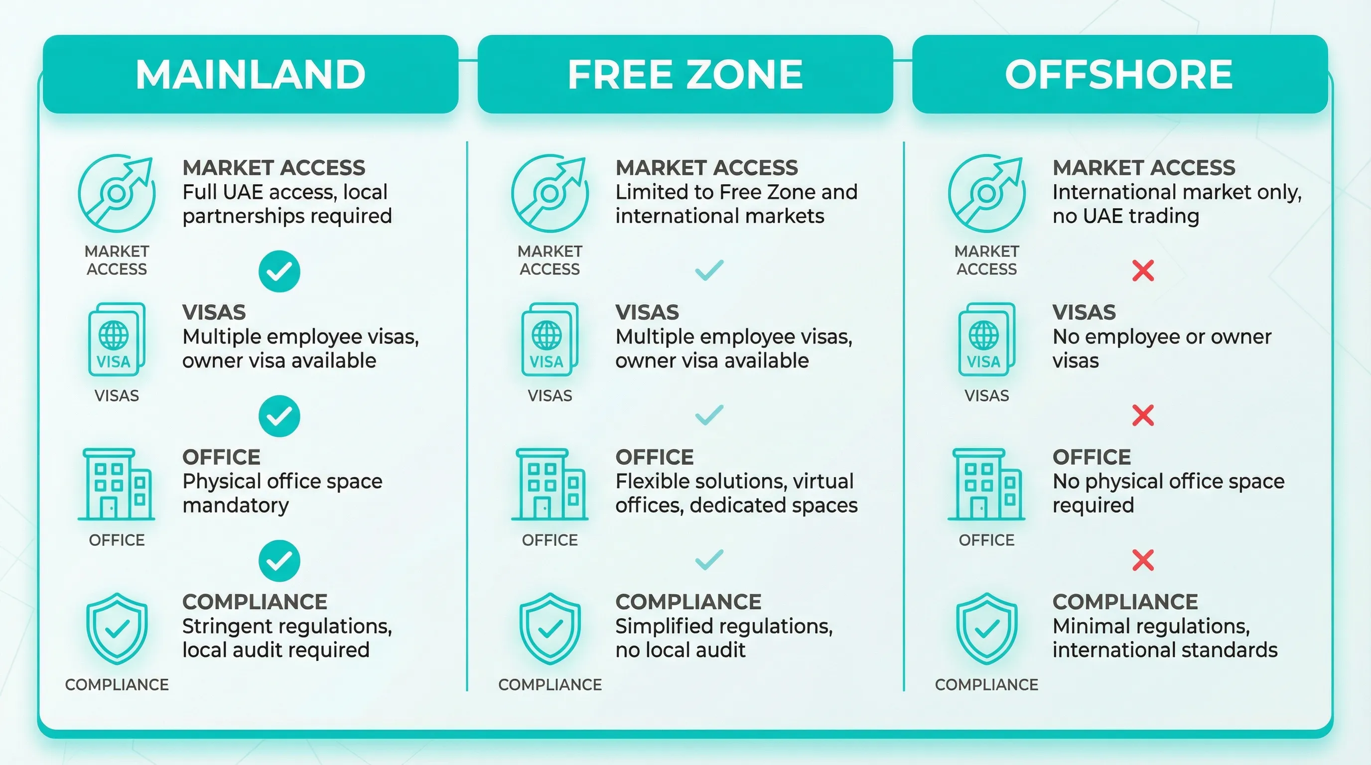 Quick comparison table: Mainland vs Free Zone UAE vs Offshore