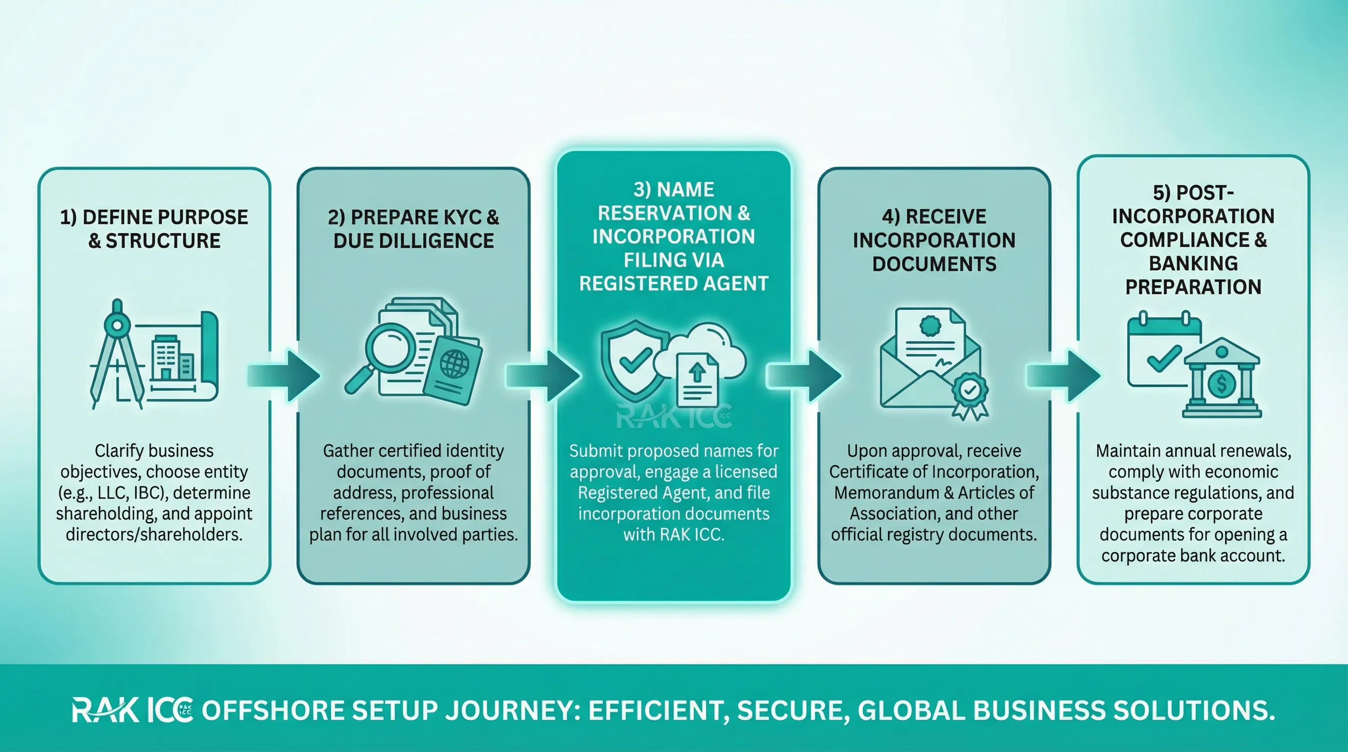 While the exact workflow varies by registered agent and shareholder profile, most RAK ICC incorporations follow a consistent pattern.