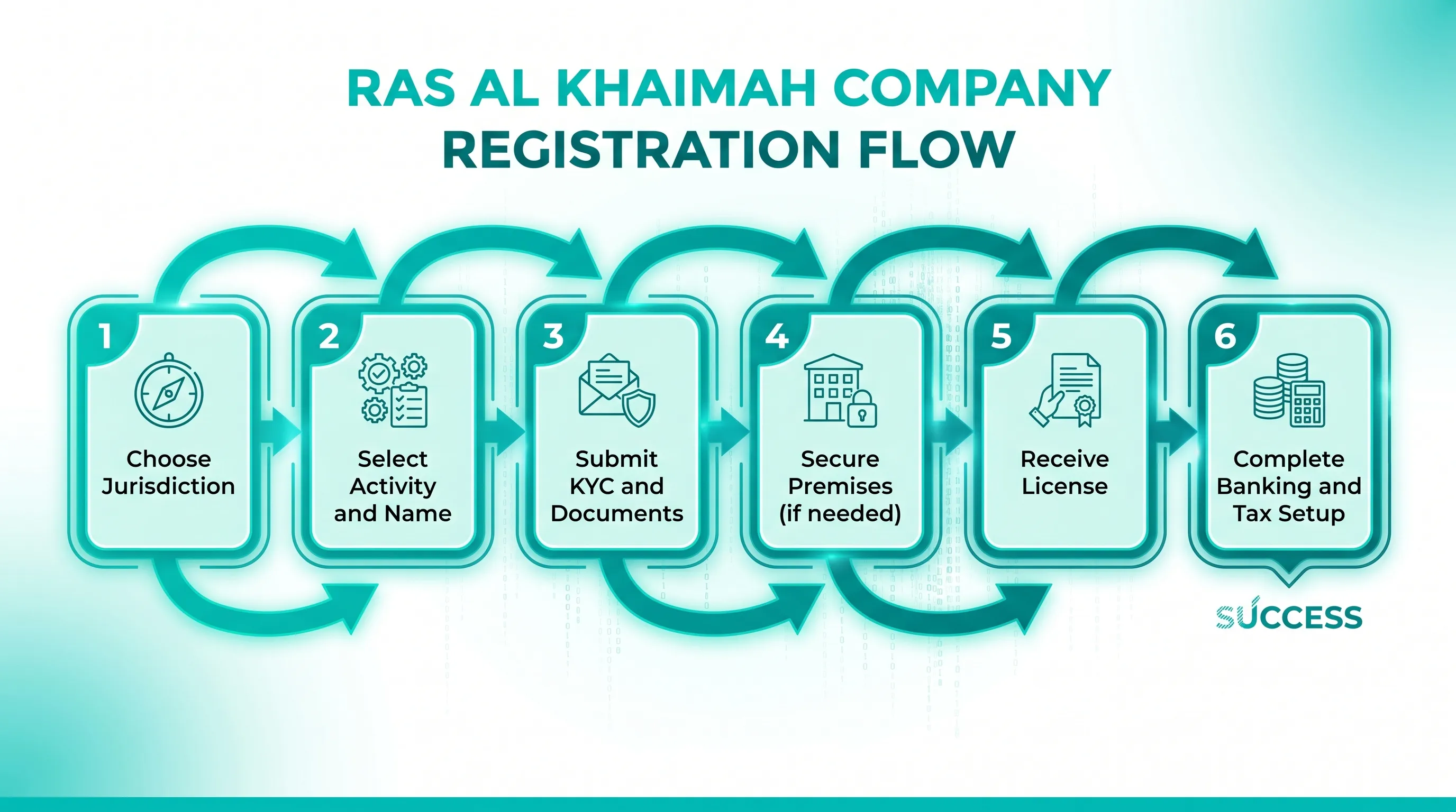 While details vary by authority and activity, most Ras Al Khaimah setups follow the sequence below.