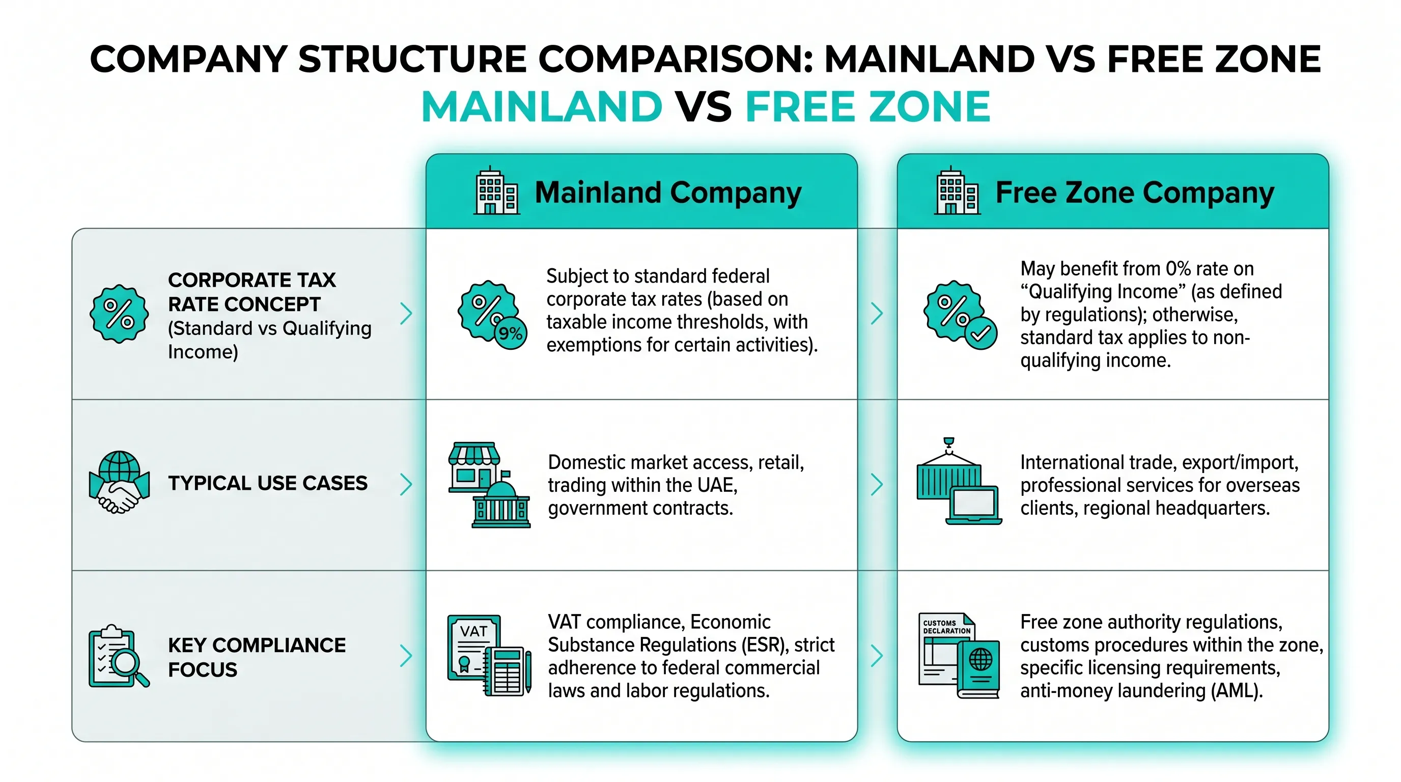 Because Corporate Tax now applies broadly, UAE entity choice is less about “tax vs no tax” and more about: